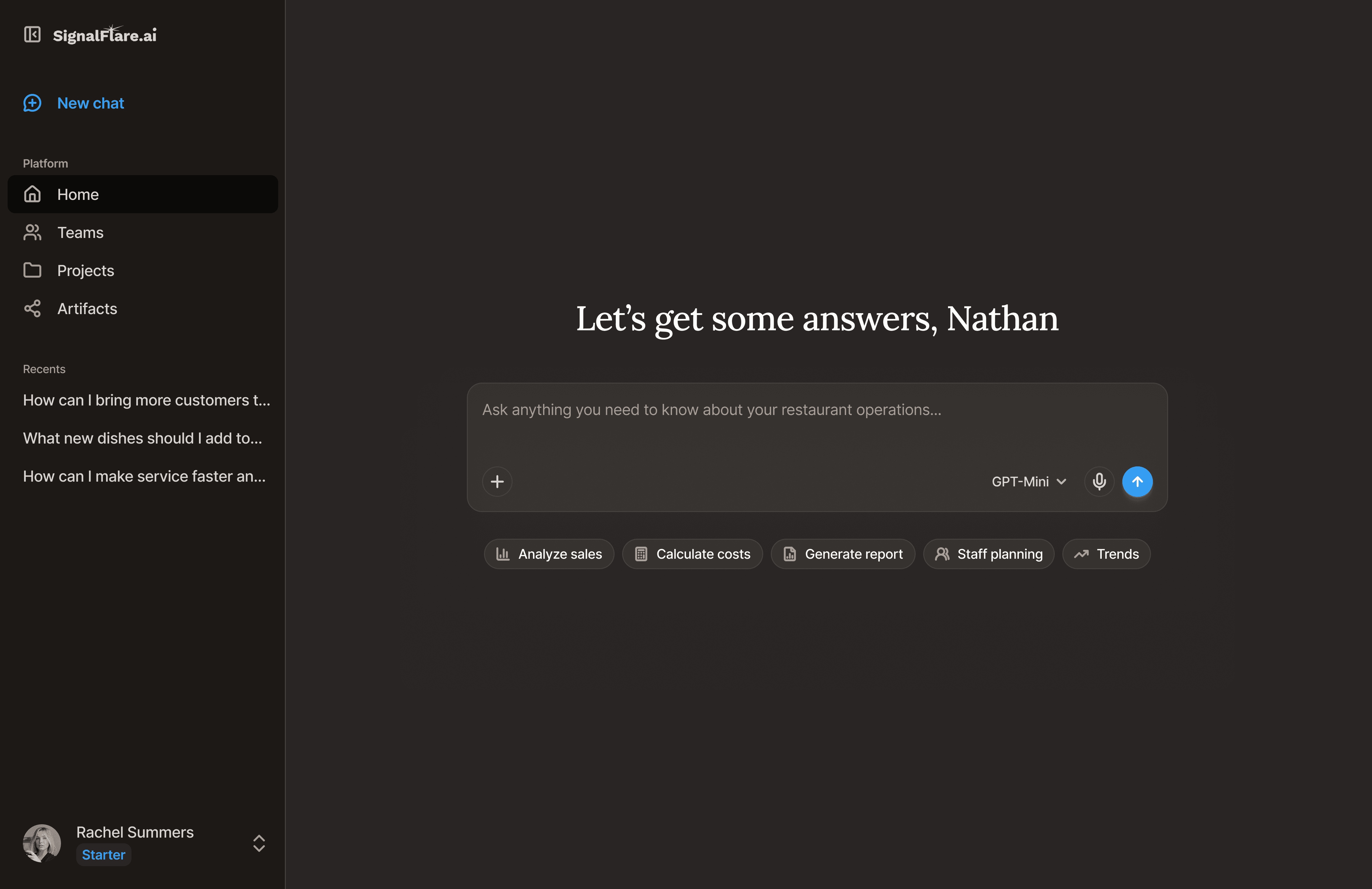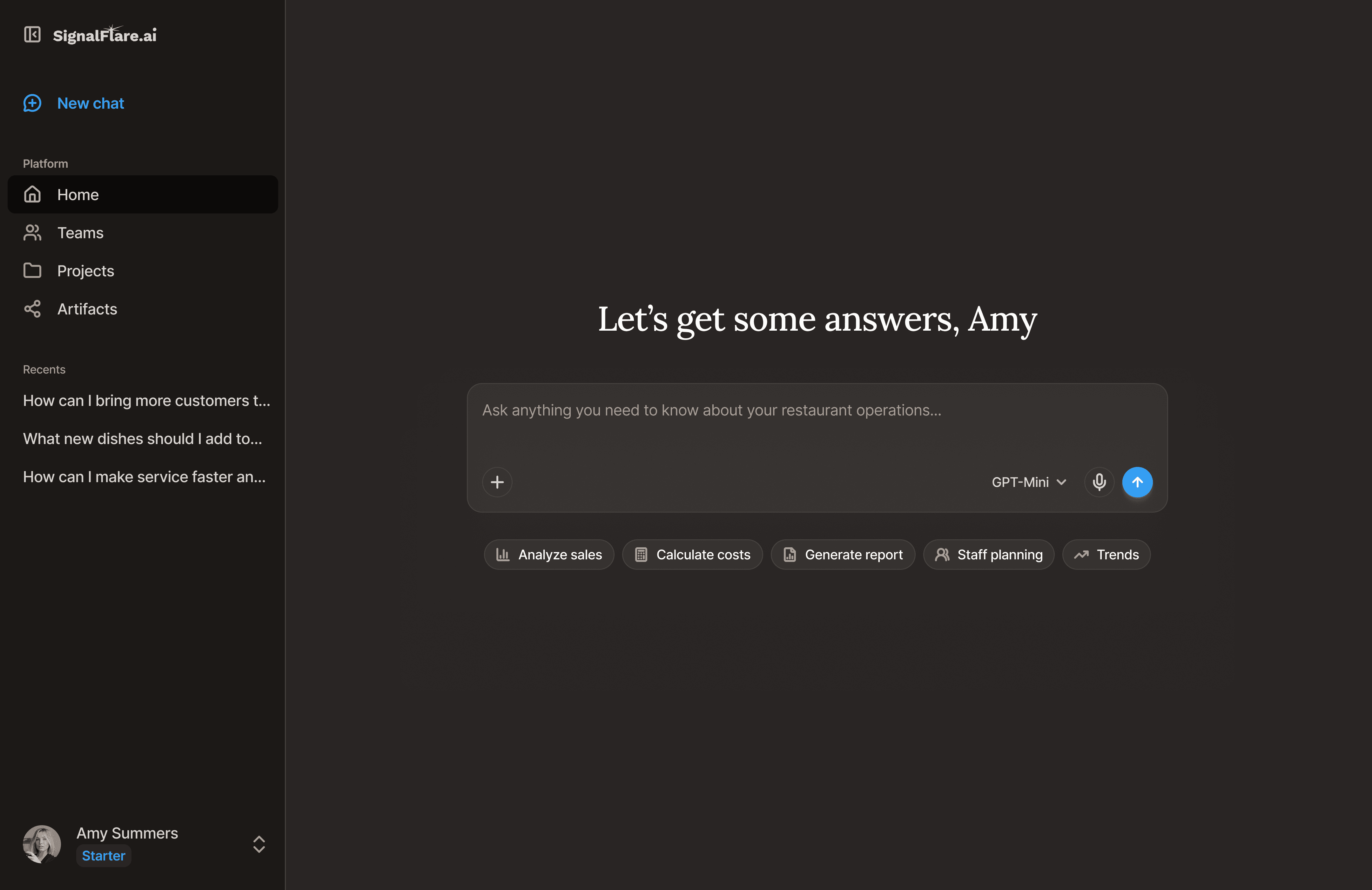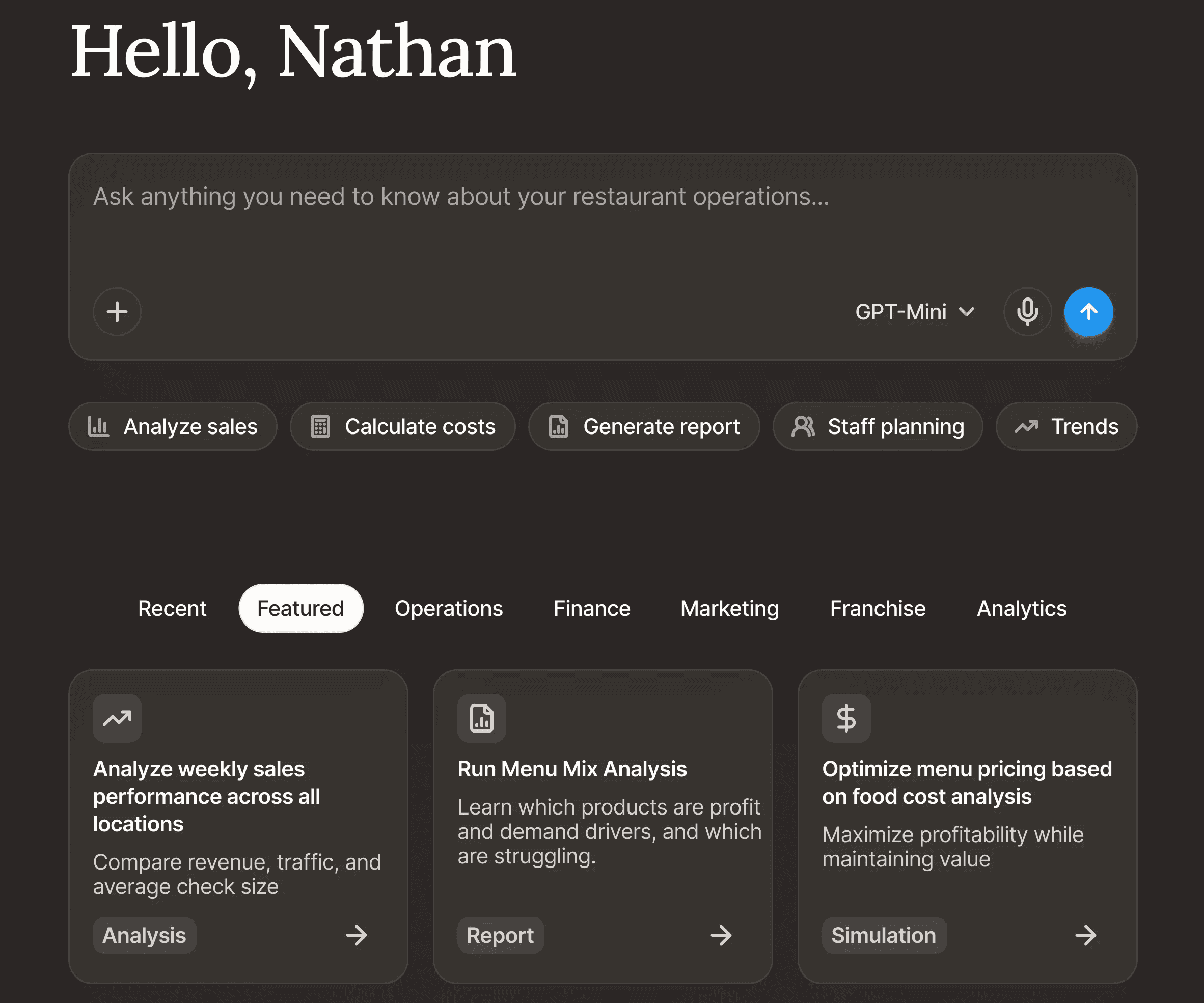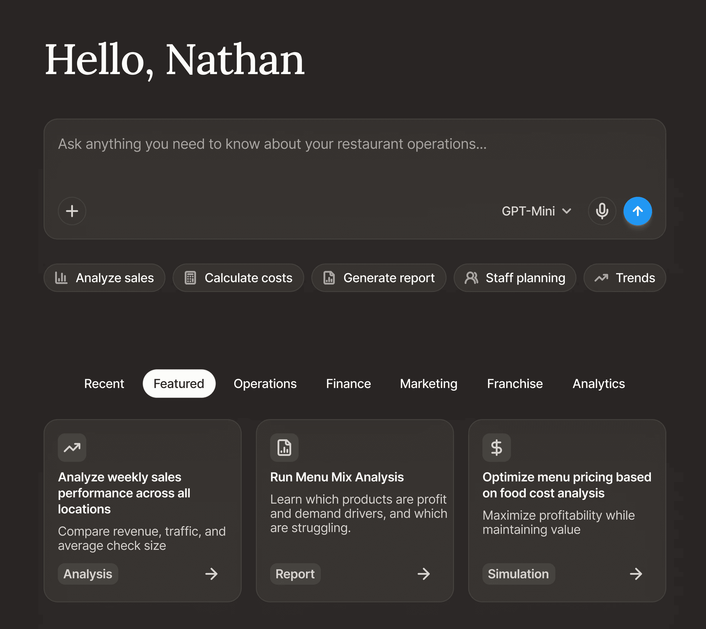 Dayparts. Menu mix. Prime cost decomposition. The agents know what you mean before you ask.