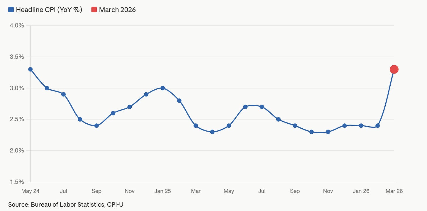 The March Consumer Price Index, released by the Bureau of Labor Statistics on April 10, 2026, landed with a headline number that stopped two years of gradual progress cold. Headline CPI rose to 3.3 percent year-over-year, up from 2.4 percent in February — the highest reading since May 2024. The gasoline index rose 21.2 percent in a single month, the largest one-month increase in BLS records dating to 1967.