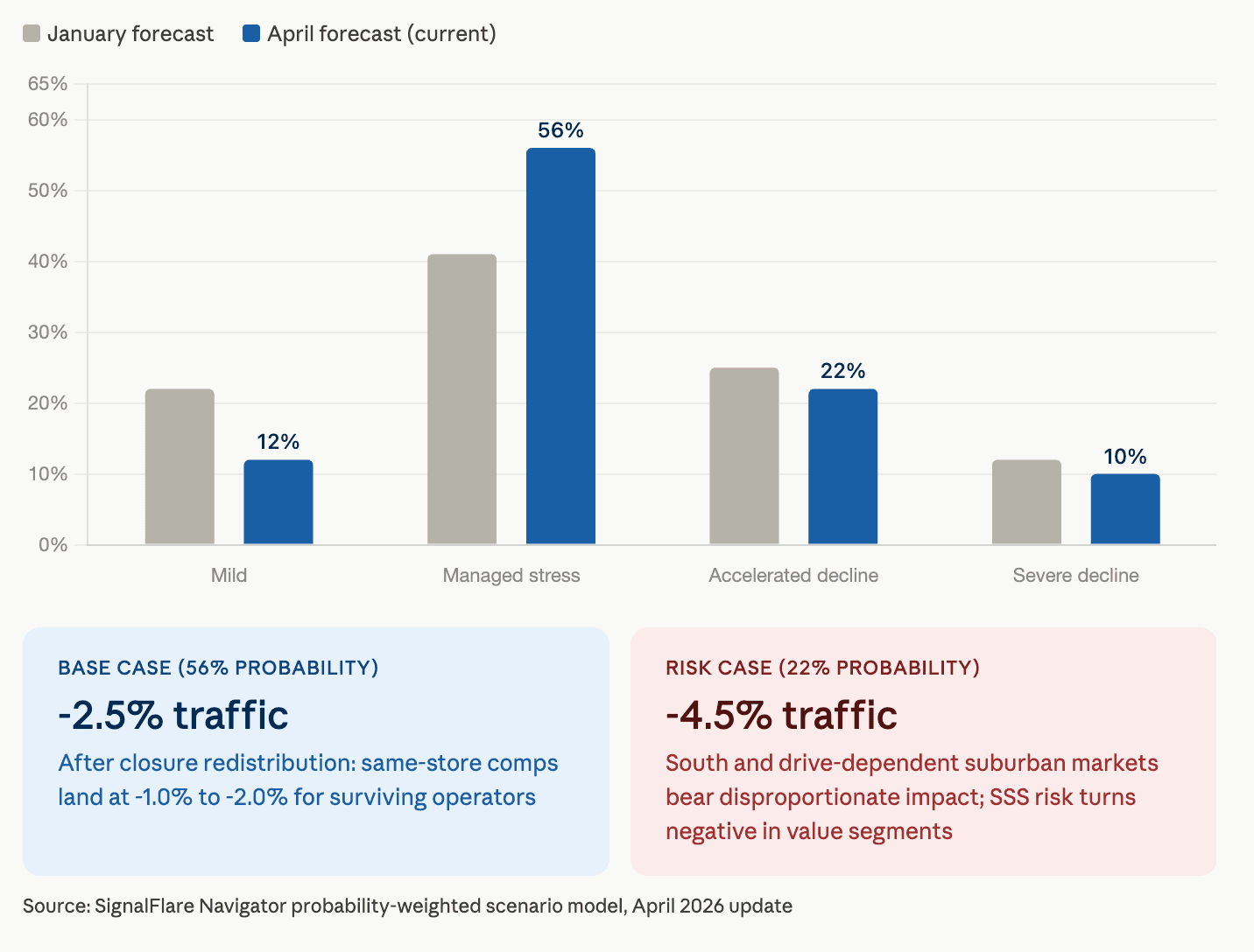 The scenario distribution has shifted. Managed Stress — defined as an environment where operators absorb the headwind through value positioning and menu rationalization without broad closure acceleration — is now the modal scenario at 56 percent probability, up from 41 percent in January. For surviving operators, the picture is better still. Closure redistribution adds an estimated 0.5 to 1.5 percentage points to same-store comps, putting the practical range at negative 1.0 to negative 2.0 percent under the base case.