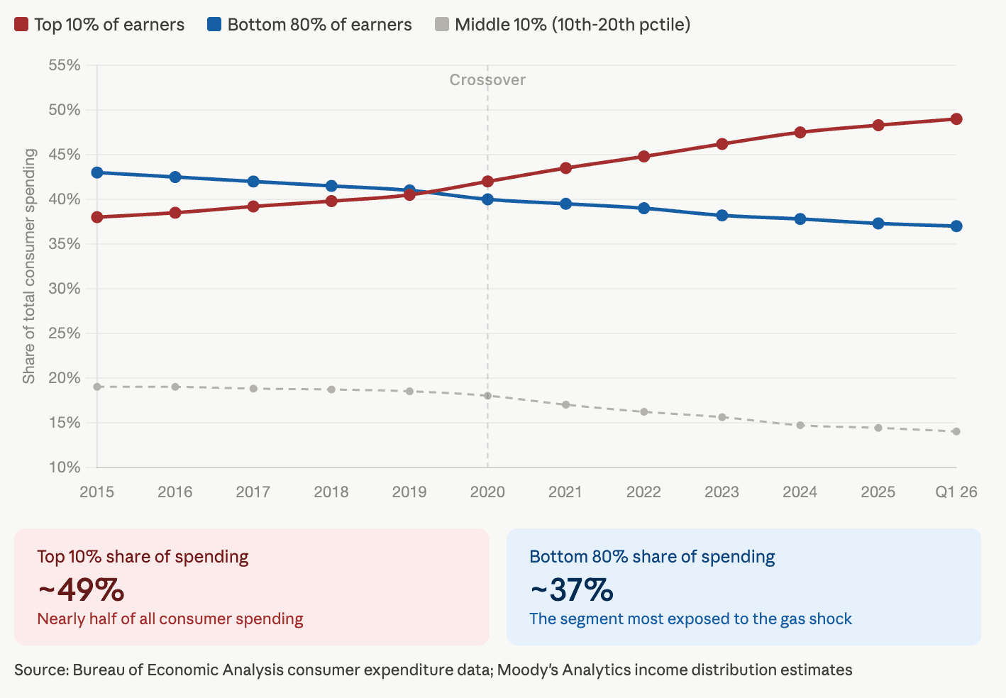 The consumer side carried a parallel problem. The bottom 80 percent of U.S. earners account for roughly 37 percent of consumer spending. The top 10 percent account for nearly half, according to Bureau of Economic Analysis data. Those lines crossed around 2020 and have been diverging since. The lower-income consumer — the core quick-service customer — had already been managed through discounting and value offers before 2026 began. The personal saving rate sat at 3.5 percent and falling. The discount was doing the work that income growth was not. There was no buffer.