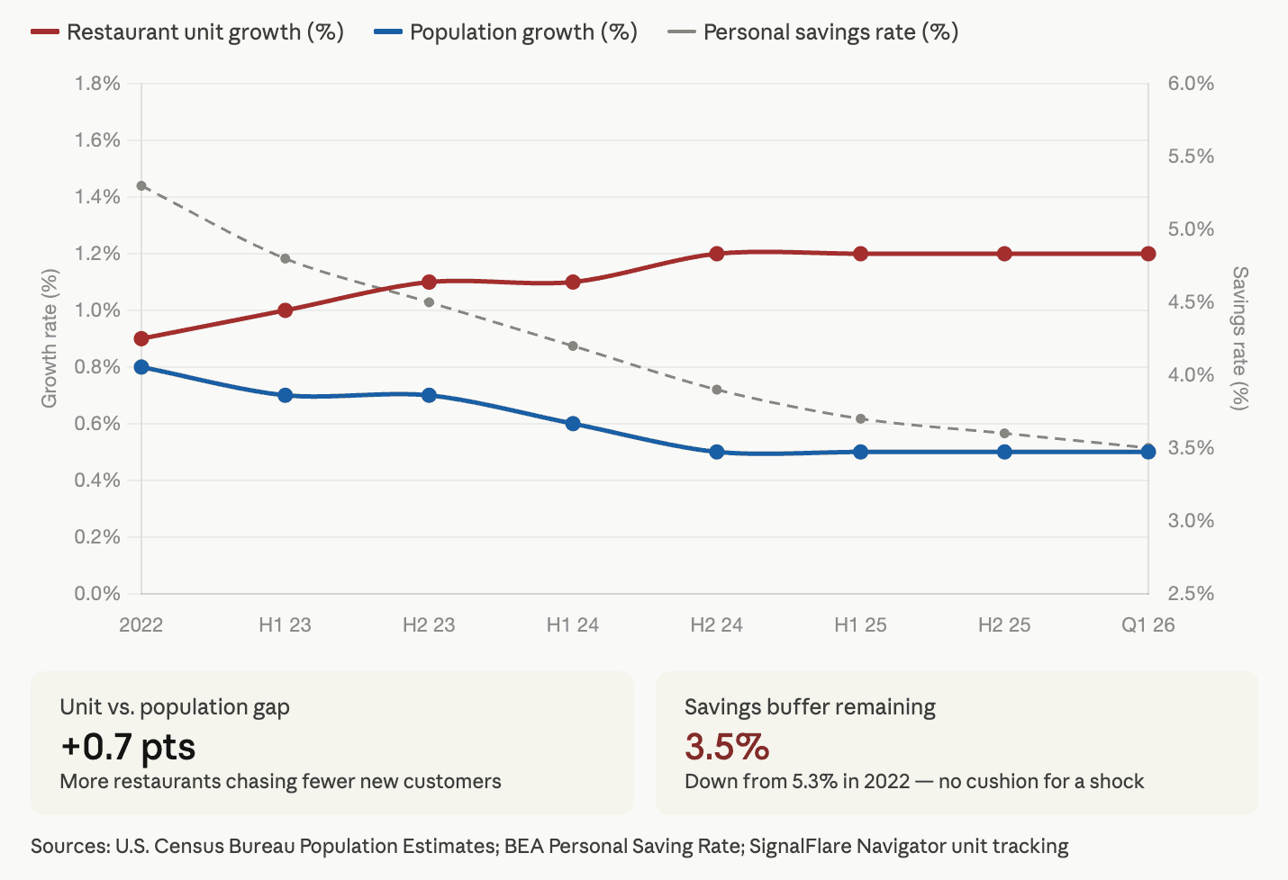 Restaurant unit count had been expanding at roughly 1.2 percent annually while national population growth decelerated to 0.5 percent in 2024–2025, a 35 percent drop from the prior year’s pace, according to U.S. Census Bureau estimates. Even the fastest-growing Sun Belt markets were slowing. Florida’s population growth rate dropped 43 percent year-over-year. Texas dropped 36 percent. The organic customer inflow that operators built expansion models around was arriving at lower rates than projected. In most trade areas, market share had become the only viable growth mechanism.